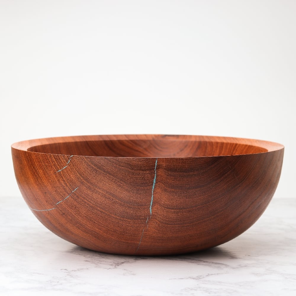 This beautiful bowl was hand-turned from responsibly sourced mesquite wood from the Tucson area. I used turquoise and copper powder to fill several cracks in the wood.